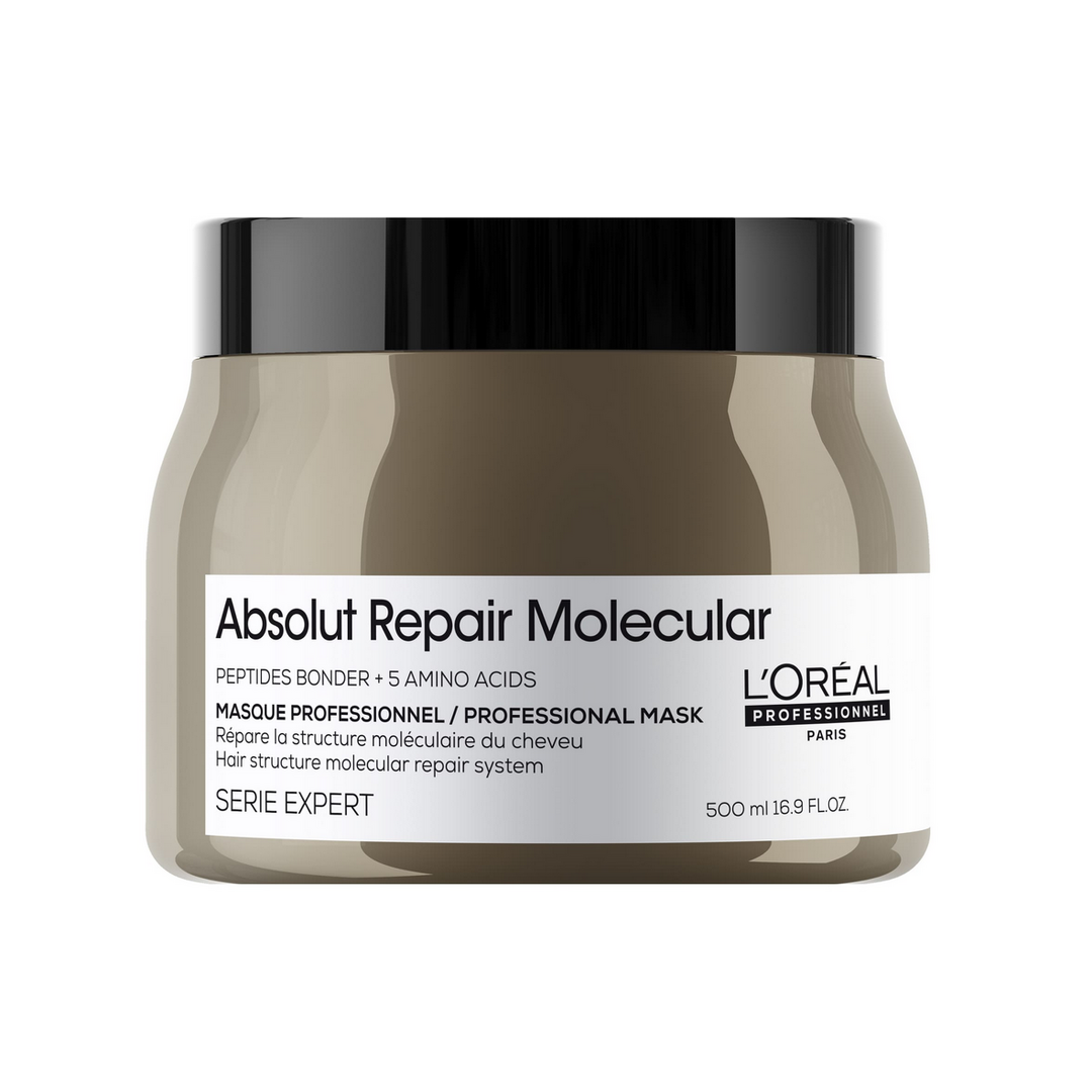Una línea profesional L’Oréal Absolut Repair Molecular pensada para reparar en profundidad el cabello muy dañado o frágil, con tecnología molecular que reconstruye la fibra desde el interior. Fortalece, suaviza y restaura la elasticidad del cabello, dejándolo más resistente, sedoso y con un acabado brillante y saludable.